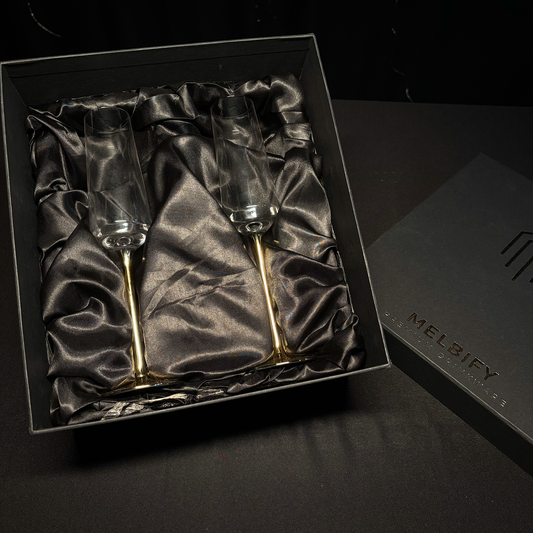 Melbify Gold Stem Champagne Flutes Glasses Gift Set | 300 ML | Set of 2 | Elegant Gift Box | Ultra-Premium Wine Glass |Luxury|Fancy|Crystal Glass | Limited Edition|Perfect for Red White Wine & Champagne|Ideal For Wedding Couple Anniversary Gift
