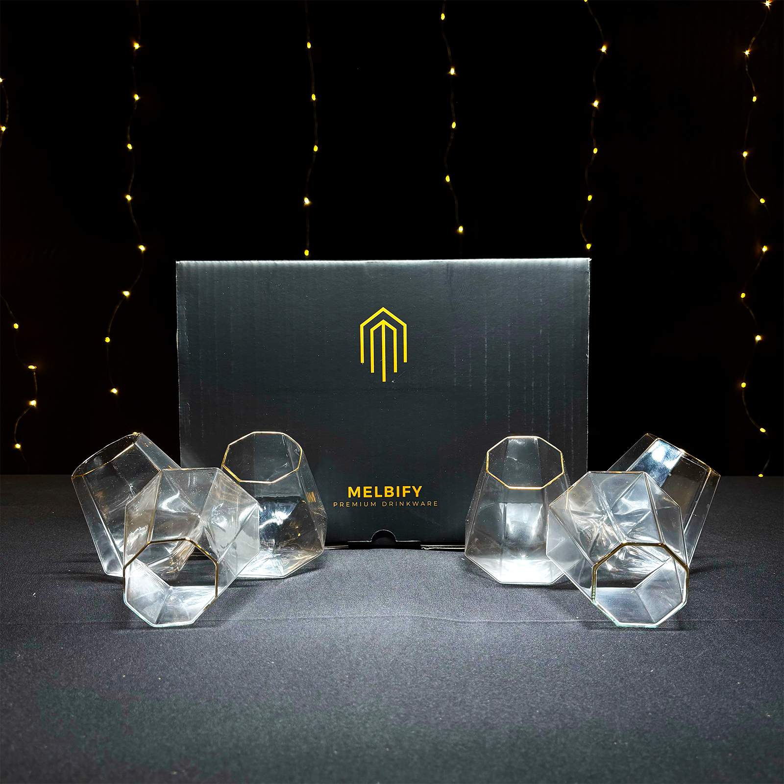 Melbify Prism Shaped Whiskey Glasses with Gold Rim Gift Set| Set of 6 |Ultra-Premium|Imported|Luxurious|Ideal for wedding gifts, anniversary, VIP and corporate gifts